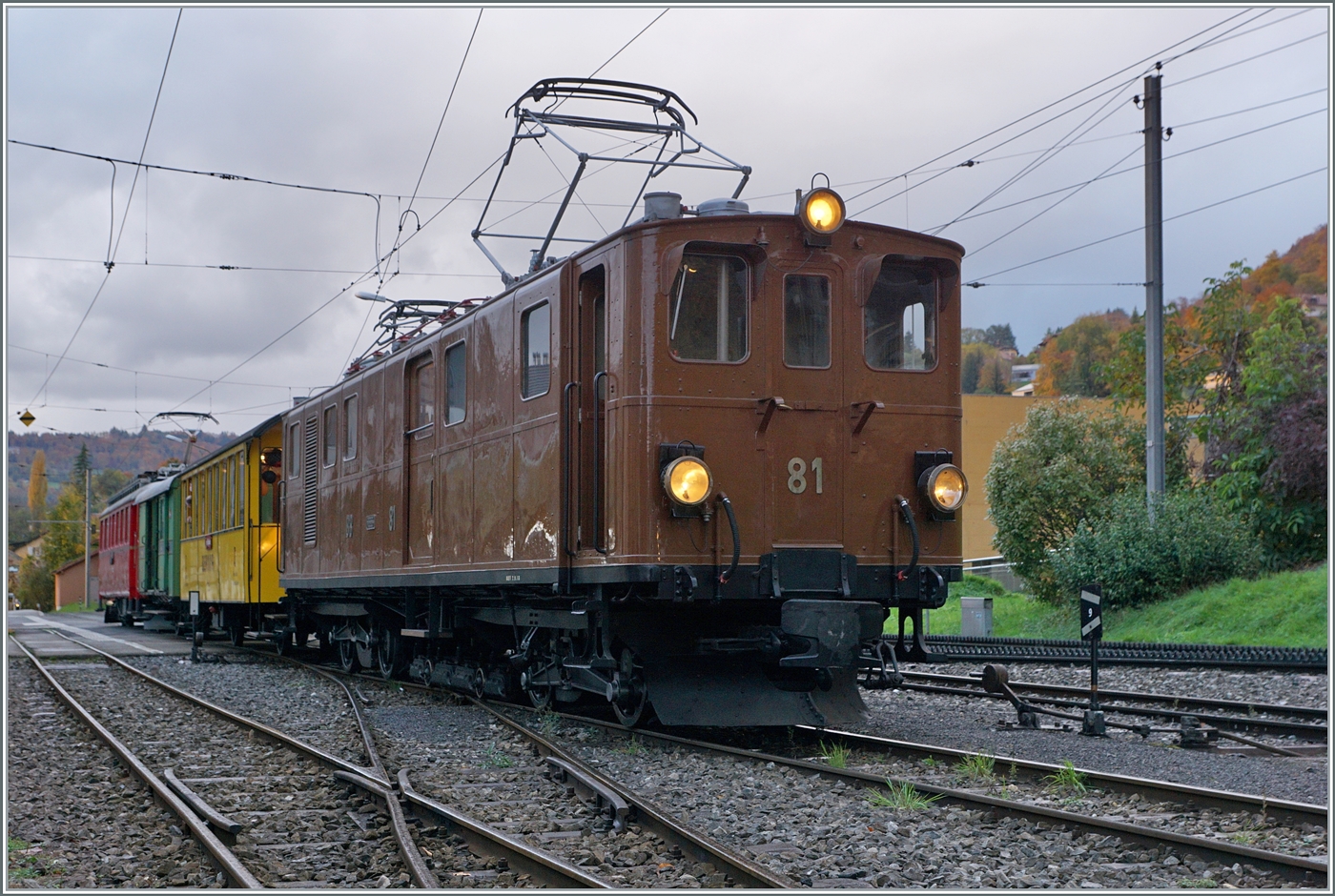 Der Bernina Bahn RhB ABe 4/4 I 35 der Blonay Chamby Bahn ist nun in Blonay mit dem mitzunehmenden Personenwagen bereit für die Leerrückfahrt nach Chaulin.