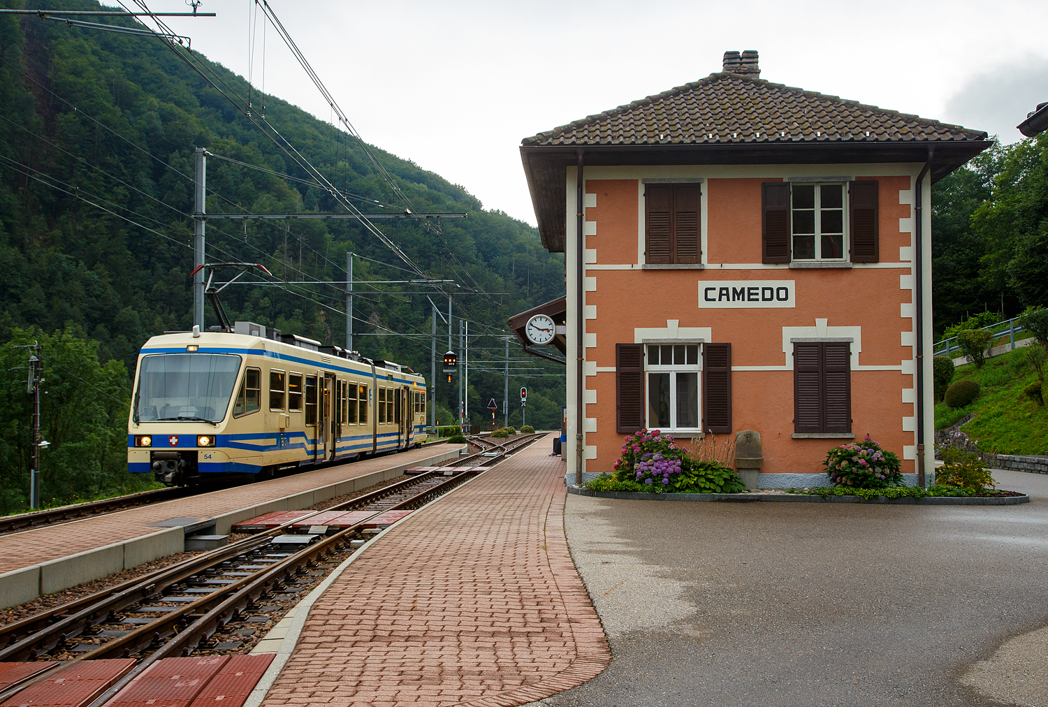 Gleich hinter dem neuen FART ABe 8/16 steht der SSIF ABe 6/6 N° 35 "Verbania" (UIC 84 83 4660 035-6 I-SSIF), der als Regionalzug von Re gekommen, hier gereinigt wurde und im Laufe des Tages nach Re zurück fahren wird.