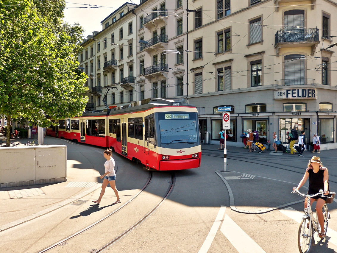 Drei gekuppelte Stadler Be 4/6 (Nr. 62, 67und 68 „Egg“) der Forchbahn fahren am 07.06.2015 vom Bahnhof Zürich Stadelhofen als S18 in Richtung Esslingen los, hier fahren sie gerade die Kreuzbühlstrasse hinauf.