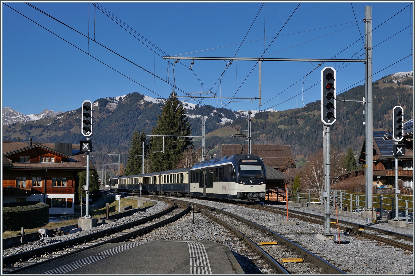 Ein Blick unter der Barriere in Chernex auf den neuen ZAGRO E-MAXI (mit Batterieantrieb). Das Bild zeigt, dass der ZAGRO E-MAXI vier Achsen aufweist, wobei die beiden inneren Achsen wohl gummibereif und ohne Spurkranz dem Antrieb auf Schiene und Strasse dienen.