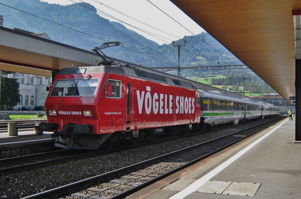 Die SOB (Südostbahn) Re 456 094-2 "Herisau " (91 85 4456 094-2 CH- SOB) im Vögele Shoes Design ist am 29.09.2012 (3:30 Uhr) mit dem Voralpen Express in Luzern abgestellt.