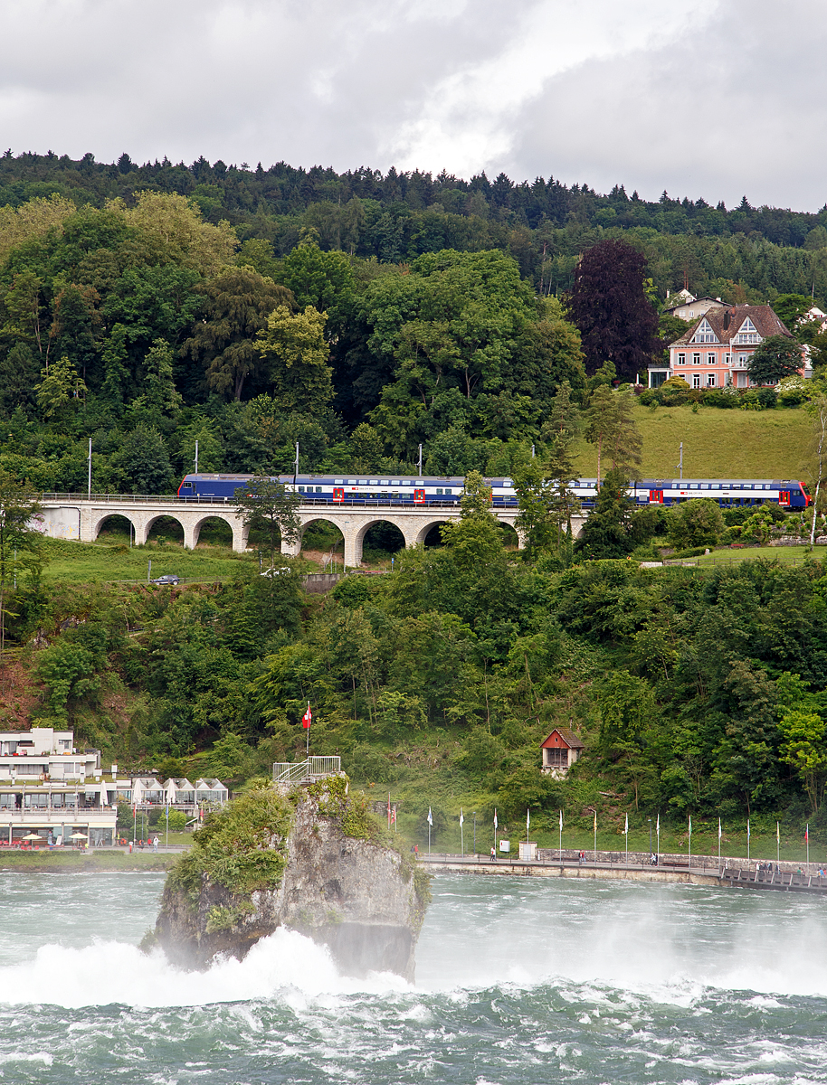 Geschoben von der SBB Re 450 000-5 "Seebach", ex Re 4/4 450 000, erreicht ein Doppelstock-Pendelzug (der erste Generation) der Zürcher S-Bahn als S7 nach Winterthur in den Bahnhof Zürich-Tiefenbrunnen.