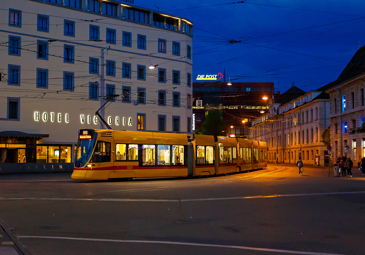 Straßenbahn Basel: Der BVB-Triebwagen Be 6/8 - 5016 ein siebenteiliger Bombardier FLEXITY 2 – Flexity Basel kommt am 29.12.2019 als Linie 3 in Richtung Birsfelden Hard in Basel den Kohlenberg hinab.