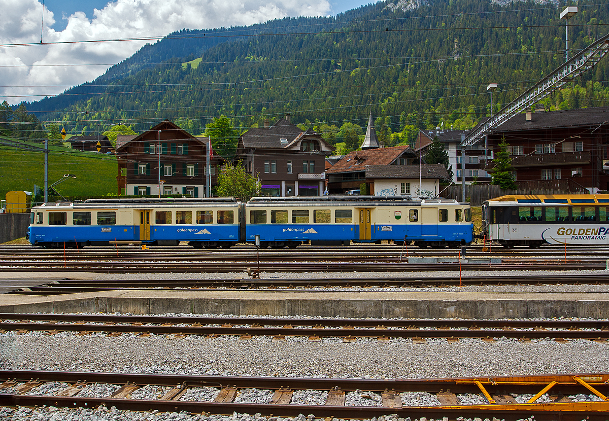 Der Doppeltriebwagen MOB ABDe 8/8 4002 „Vaud“ (deutsch Waadtland) der Montreux–Berner Oberland-Bahn (französisch Chemin de fer Montreux-Oberland bernois) steht im Bahnhof Zweisimmen am 28.05.2012 mit angehängten Wagen, zur Abfahrt bereit nach Montreux bereit. Dieser meterspurigen Doppeltriebwagen MOB ABDe 8/8 wurde 1968 in einer Serie von 4 Stück (4001 bis 4004) von SIG, BBC und SAAS für die MOB gebaut und bildeten lange Zeit das Rückgrat der Zugförderung auf der Strecke Montreux – Zweisimmen, die eine Steigung bis zu 73 ‰ ohne Zahnstange hat. Sie traten an die Stelle der Triebwagen der 3000er-Serie, den BDe 4/4 Nr. 3001-3006, die in zwei kleinen Serien in den Jahre 1944 und 1946 beschafft wurden. Auf den steilsten Streckenabschnitten waren die Doppeltriebwagen, die am jeweiligen Ende über einen Führerstand mit Übergangseinrichtung zu den angehängten Wagen verfügten, in der Lage bis zu fünf Personenwagen mit einem Maximalgewicht von 80 t auf der Maximalsteigung von 73 ‰ zu befördern. Die beiden Wagenkästen in leichter Stahlbauweise, stützten sich auf jeweils zwei Drehgestelle ab und sind untereinander kurzgekuppelt. Sie können nicht alleine verkehren. Der Antrieb jeder Achse erfolgt über jeweils ein im Drehgestell, in der Längsrichtung angeordneter Motor, über ein Schneckengetriebe. Eine halbautomatische Steuerung ermöglicht eine selbständige Regulierung der vorgewählten Geschwindigkeit. Eine Widerstandsbremse ermöglicht das verschleißfreie Beharren des Zuges in den Steilstrecken sowie dessen Abbremsen. Ist das Stromnetz für eine Einspeisung von Strom aufnahmefähig, wird der Strom, statt in den Bremswiderständen vernichtet zu werden, über die Rekuperationsbremse soweit möglich ins Netz eingespeist. Der Triebwagen verfügt zudem über eine Druckluftbremse, sowie ein Vakuumbremse für die angehängten Wagen, die nicht über eine Druckluftbremse verfügen. Mit der Beschaffung der Lokomotiven mit Gepäckabteil bzw. Gepäcktriebwagen GDe 4/4 Nummer 6001 bis 6004 die ab dem Jahre 1983 in Betrieb gesetzt wurden und in der Lage waren 110 t auf der Maximalsteigung zu führen, sowie dem Aufkommen des Panoramic Expresses zwischen Montreux und der Lenk wurden diese Doppeltriebwagen in untergeordnete Dienste versetzt. Auf der Grundlage des mechanischen wie auch der elektrischen Konstruktion entstanden in der Folge ab dem Jahre 1976 die Pendelzüge der Serie 5000, mit den Be 4/4 5001 bis 5004 und den dazugehörenden Steuerwagen ABt 5301 bis 5304. Am 2./3. September 2017 wurden die Triebwagen offiziell außer Dienst gestellt. Als Reserve werden drei aber noch vorgehalten. Der Triebwagen 4003 „Bern“ wurde 2018 leider abgebrochen. TECHNISCHE DATEN: Gebaute Stückzahl: 4 Hersteller mech. Teil: SIG (Schweizerische Industrie-Gesellschaft) Hersteller elektr. Ausrüstung: SAAS (Société Anonyme des Ateliers de Sécheron) Hersteller der Motoren: BBC Spurweite: 1.000 mm (Schmalspur) Achsformel: Bo'Bo' + Bo'Bo' Länge über Puffer: 33.500 mm Länge des Kastens: 2 x 16.00 mm Drehzapfenabstand: 11.350 mm Achsabstand im Drehgestell: 2.100 mm Raddurchmesser: 750 mm Höhe: 3.750 mm Breite: 2.680 mm Leergewicht: 60 t Stundenleistung: 880 kW Anfahrzugkraft: 185 kN Stundenzugkraft: 97 kN Übersetzung: 1:7,2 Höchstgeschwindigkeit: 70 km/h Anzahl der Fahrmotoren: 8 Fahrleitungsspannung: 850 V DC (Gleichstrom) Stromabnehmer : 2 Sitzplätze: 18 in der 1. Klasse / 68 in der 2. Klasse Ladefläche: 7,8 m² Zuladungsgewicht: 2,0 t