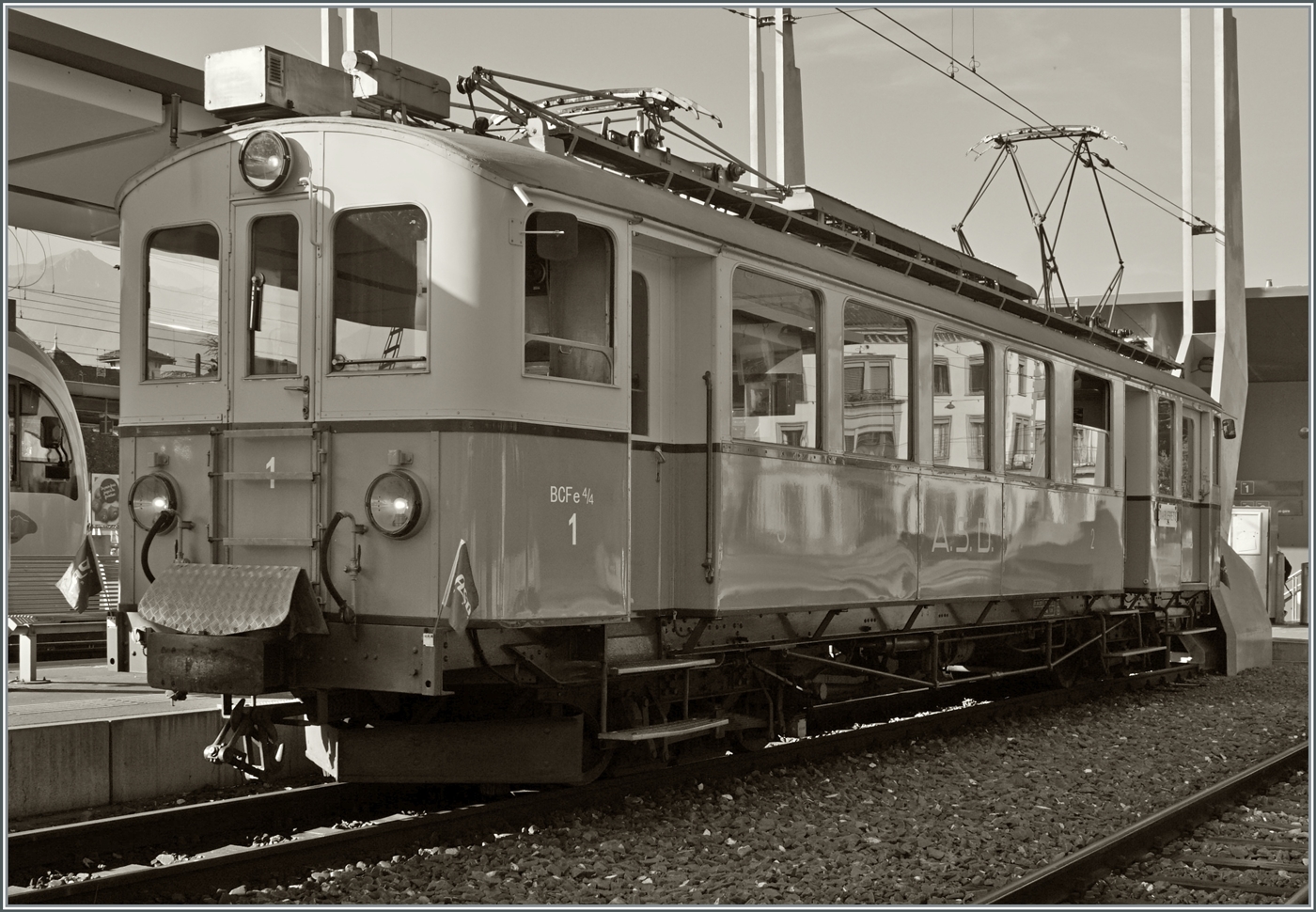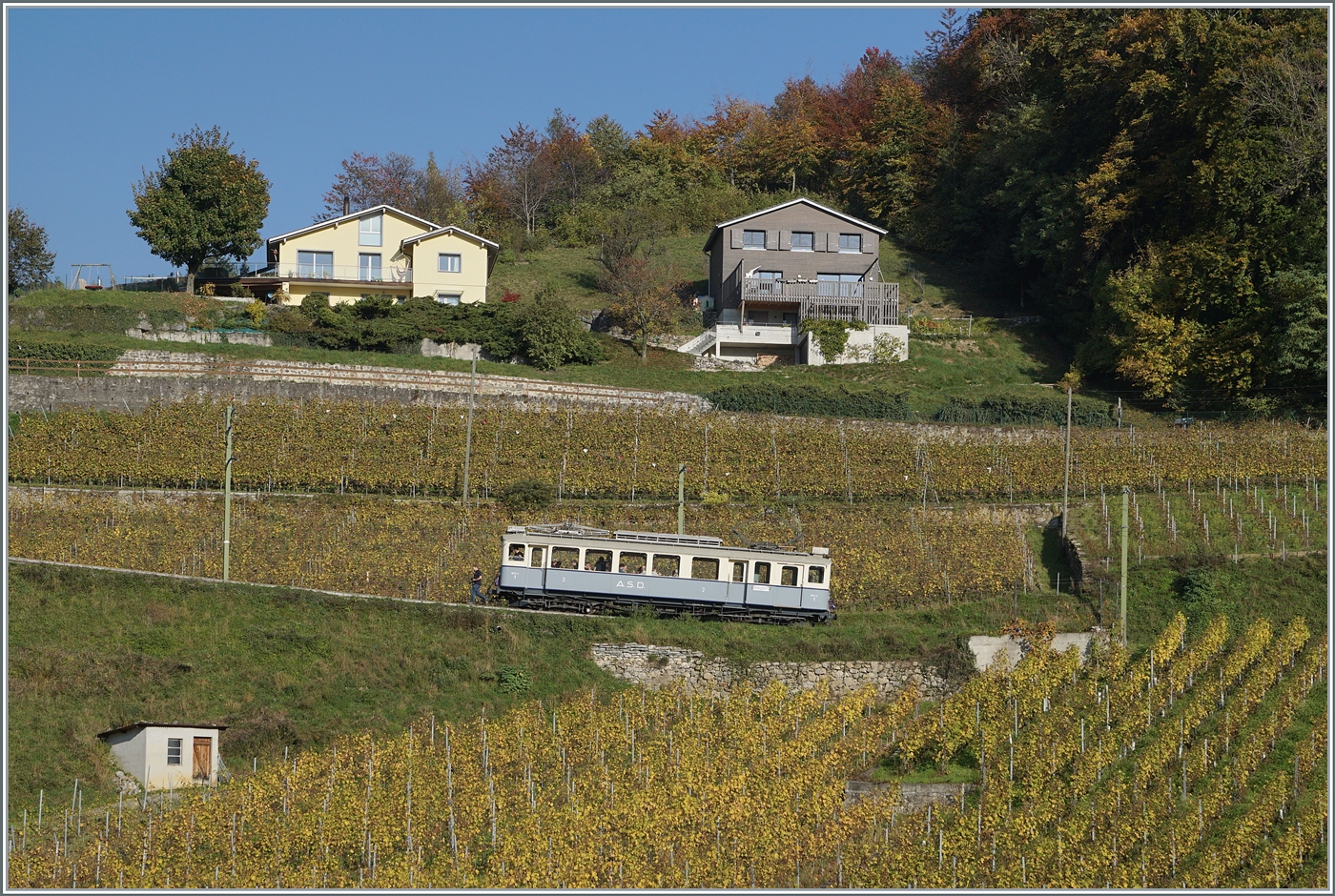 Nachdem ich mich beeilt hatte, an der Strecke eine Fotostelle zu finden, musste ich nicht lange warten, bis der ASD 1914 BCFe 4/4 N° 1 kam und in den herbstlichen Rebbergen ein gutes Bild abgab.