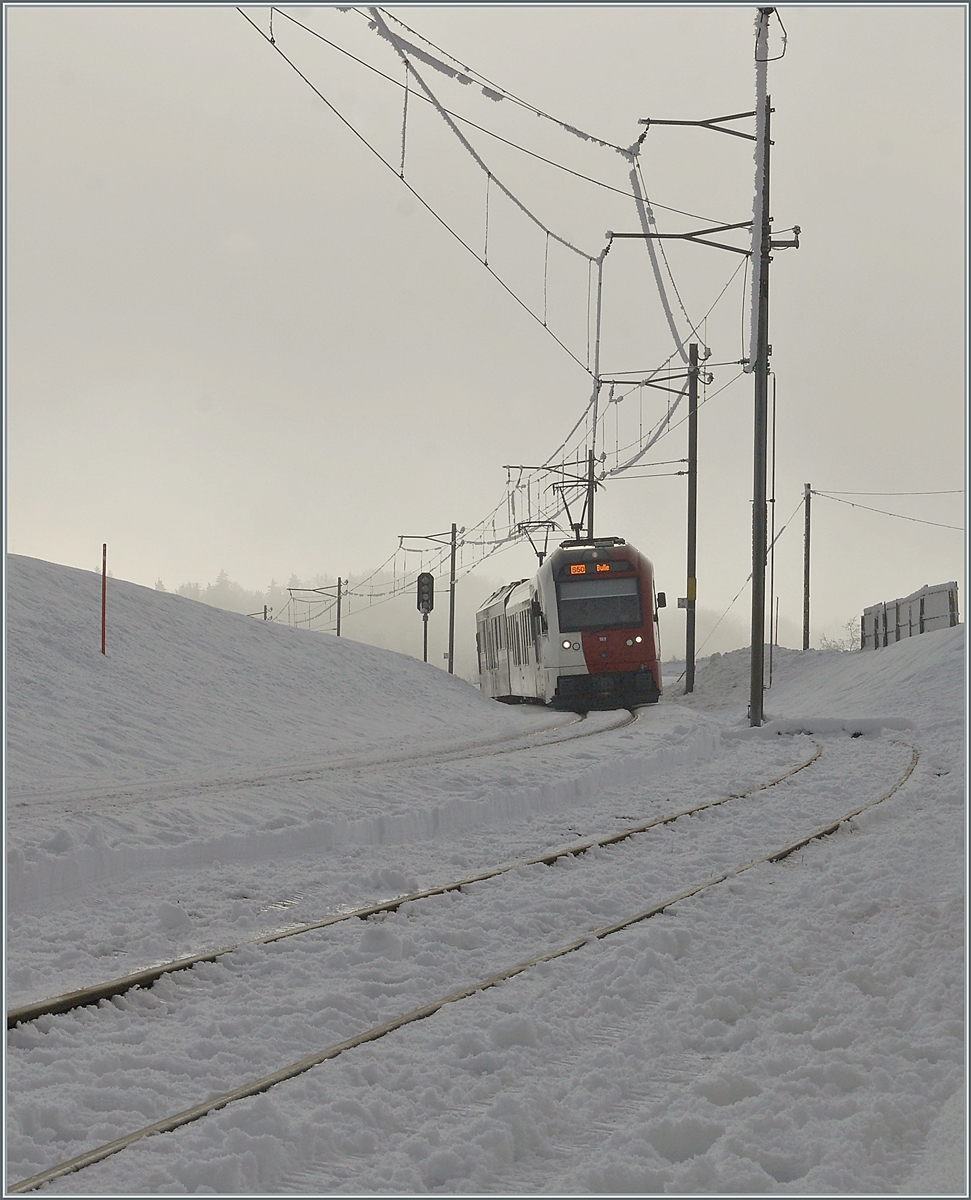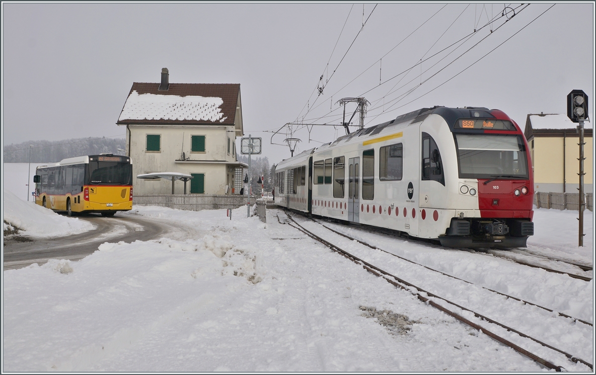 TPF Normal- und Schmalspur in Bulle mit dem Be 2/4 103 nach Gruyère und einem TPF RBDe 560 "Domino" nach Bern.