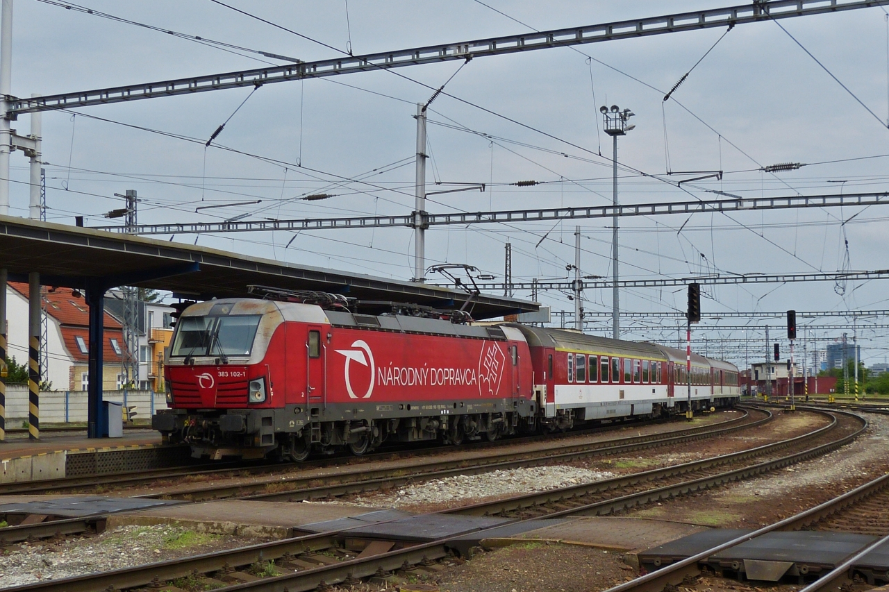 Vectron Lok 383 102-1 (91 56 6383 102-1SK-Rail).fährt mit einem Personenzug in den Bahnhof von Bratislava ein. 05.06.2023