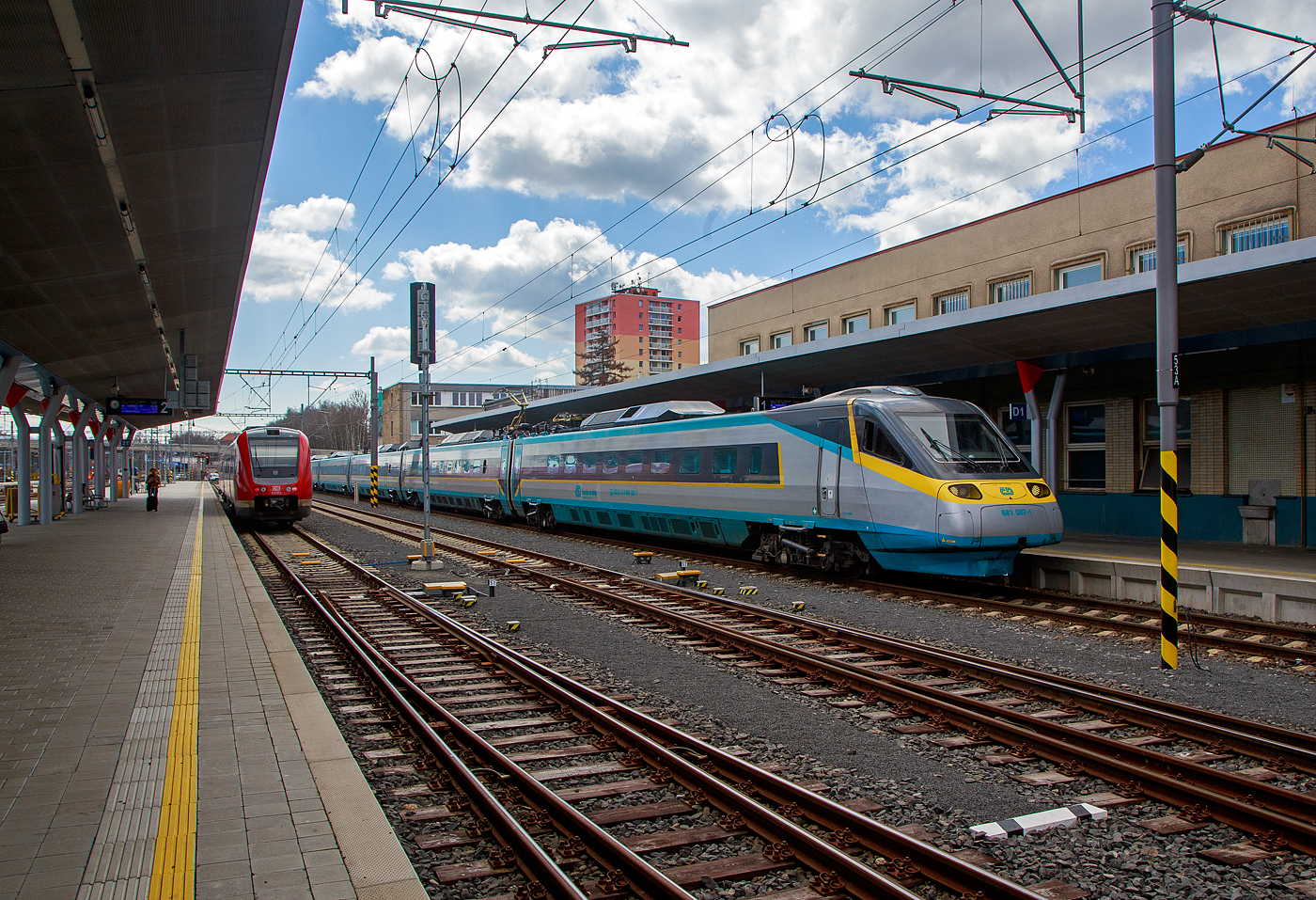 Der tschechische Pendolino 681 007-1 / 681 007-0 der ČD (České dráhy) erreicht am 19.04.2023 als SC 512 (SuperCity) vom Bahnhof Cheb (Eger). Während links der  RegioSwinger  612 472 / 612 972 der DB Regio Bayern als RE 33 via Marktredwitz nach Nürnberg Hbf zur Abfahrt bereit steht.