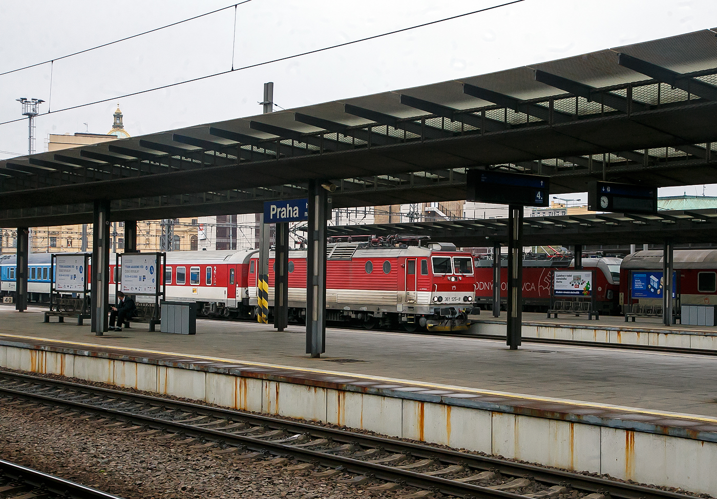Leider nur über den Bahnsteig hinweg.... Die ZSSK 361 125 -8 (91 56 6 361 125-8 SK- ZSSK) erreicht am 23.11.2022 mit einem EC den Hauptbahnhof Prag (Praha hlavní nádra¸í). Die Zweisystemlokomotive (3kV DC / 25kV 50 Hz.AC) wurde aus der 3 kV-Gleichstromlokomotive ex ZSSK 162.031-9, ex ´SR 163.119-1, ex ČSD BR 499.3 umgebaut. Bei den Zweisystemlokomotiven der BR 361 handelt sich um eine komplexe Rekonstruktion von 3 kV Gleichstromlokomotiven der ZSSK BR 162 (für 140 km/h) bzw. ´SR 163 (für 120 km/h) der ehemaligen ČSD-Baureihe E 499.3 (¦koda-Typ 71E) die ab 2009 von der Firma ´OS in Vrútky durchgeführt wurden. Von der ursprünglichen Baureihe 163 blieben nur der Kasten und das modifizierte Fahrgestell inklusive Fahrmotoren und Bremseinheiten erhalten. Neben der Verlängerung der Lebensdauer ist der Umbau auf ein Zweisystemfahrzeug die größte Veränderung in die BR 361.0. Spätere Loks erhielten zudem einen ETCS-Rechner und die Höchstgeschwindigkeit wurde auf 160 km/h angehoben, diese wurde als BR 361.1 eingeordnet (wie diese hier). Die ursprüngliche ČSD-Baureihe E 499.3 (¦koda-Typ 71E): Die Baureihe E 499.3 (ab 1988: Baureihe 163) sind elektrische Lokomotiven der einstigen Tschechoslowakischen Staatsbahn (ČSD) für das 3-kV-Gleichstromsystem im Norden und Osten der ehemaligen Tschechoslowakei. Die Lokomotiven wurden ab 1984 von ¦koda in Pilsen in drei Bauserien à 60 Lokomotiven gefertigt. Konstruktiv basieren die Maschinen auf den Zweisystemlokomotiven ES 499.1 (heute Baureihe 363), jedoch erhielten die E 499.3 nur die Ausrüstung für den Gleichstrombetrieb. Die Lokomotiven der Serie von 1991 wurden mit einer geänderten Getriebeübersetzung als Baureihe 162 für eine Höchstgeschwindigkeit von 140 km/h ausgeliefert. Die 1992 gebaute Serie wurde dann wiederum für nur 120 km/h Höchstgeschwindigkeit ausgelegt, um für Einsätze im Güterverkehr eine höhere Zugkraft zur Verfügung zu haben. Wegen finanzieller Probleme wurde diese Serie zunächst nicht abgenommen, so wurden neun Lokomotiven 1995 an die lombardische Bahngesellschaft Ferrovie Nord Milano Esercizio (FNME) verkauft. 40 Lokomotiven erwarben später die Tschechischen Bahnen ČD, die restlichen Lokomotiven gelangten 1995 zu den slowakischen ´SR (heute: ZSSK). Die neun nach Italien gelieferten Lokomotiven wurden 2010 vom tschechischen RegioJet erworben und gelangten zurück nach Tschechien. Die gelb lackierten Lokomotiven tragen die Nummern 162 112–120. Sowohl bei den ČD wie bei den ´SR erfolgte später bei einem Teil der 162 ein Tausch der Drehgestelle mit denen der Zweisystemlokomotiven der Reihe 363, um bei diesen die Höchstgeschwindigkeit auf 140 km/h anzuheben. Die so umgebauten 162 wurden in die Baureihe 163 umgezeichnet. Zwischen 2011 und 2017 stattete die ZSSK, mehrere Lokomotiven der Baureihen 162 und 163 mit einer Mehrsystemausrüstung für 3 kV und 25 kV aus diese werden als BR 361.0 geführt, später wurden Loks auch mit ETCS-Rechner ausgestattet und die Höchstgeschwindigkeit wurde auf 160 km/h erhöht diese werden als BR 361.1 geführt. TECHNISCHE DATEN: Umgebaut: 5 Stück in BR 361.0 und 21 Stück in BR 361.1 Spurweite: 1.435 mm (Normalspur) Achsformel: Bo’Bo’ Länge über Puffer: 16.800 mm Höhe: 4.625 mm Breite: 2.940 mm Drehzapfenabstand: 8.300 mm Achsabstand im Drehgestell: 3.200 mm Treibraddurchmesser: 1.250 mm Dienstgewicht: 86 t Höchstgeschwindigkeit: 160 km/h (BR 361.1) bzw. 140 km/h (BR 361.0) Dauerleistung: 3.200 kW (AC 25 kV~) / 3.600 kW (DC 3 kV=) Anfahrzugkraft: Stromsystem: 3 kV DC und 25 kV 50Hz AC Anzahl der Fahrmotoren: 4 (¦koda 11 AL 4542 FiR) mit je 900 kW bei DC bzw. 800 kW bei AC Leistung Antrieb: ¦koda-Hohlwellenantrieb