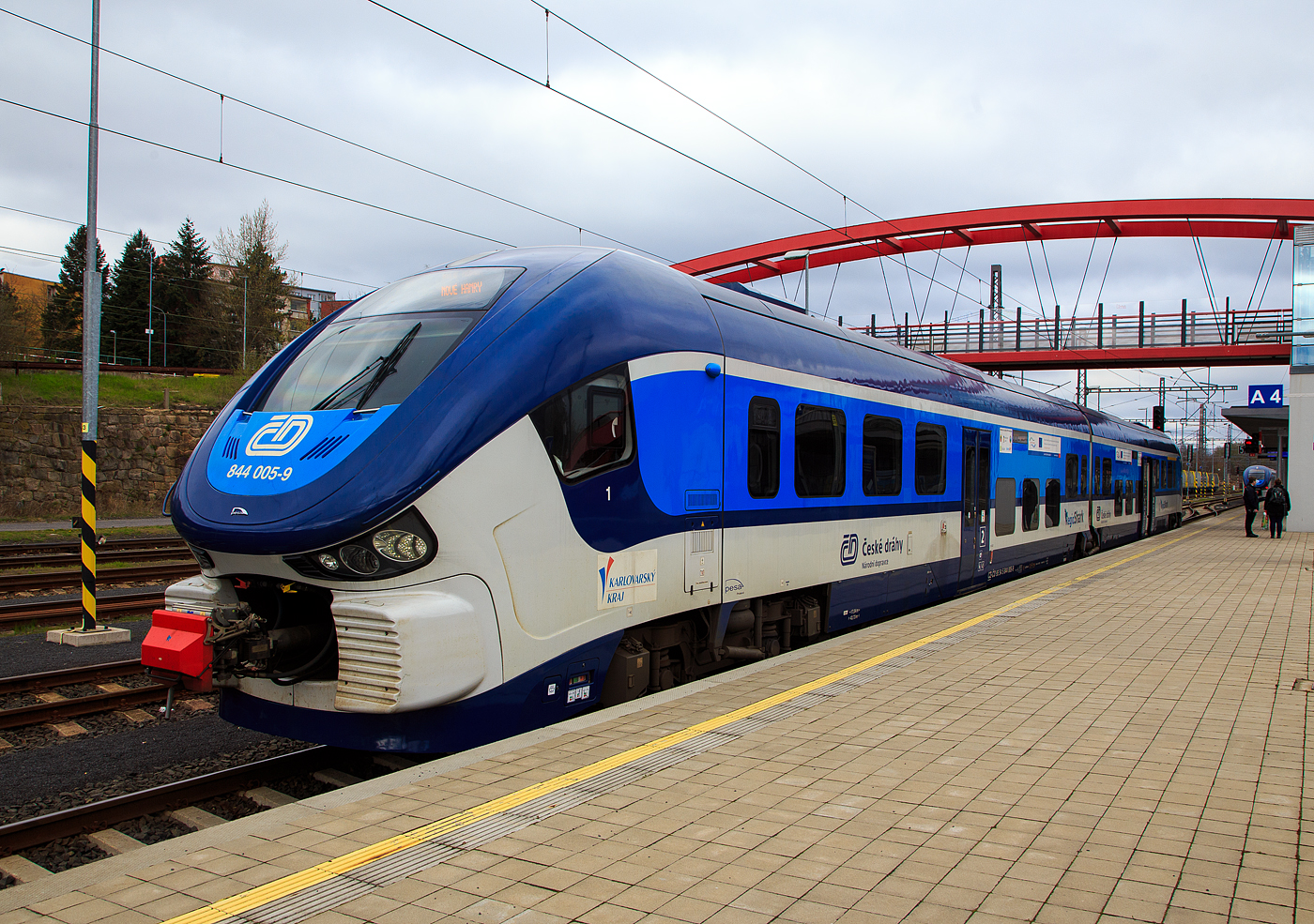 Der ČD „RegioShark“ 844 005-9 (CZ-ČD 95 54 5 844 005-9), ein Dieseltriebzug vom Typ PESA LINK II, hat am 18 April 2023 als Os 17138 nach Nove Hamry (Neuhammer) den Bahnhof Karlovy Vary (Karlsbad oberer Bahnhof) erreicht. Er muss jedoch erst abwarten bis die Strecke frei ist, bevor er weiterfahren kann. Armin Schwarz