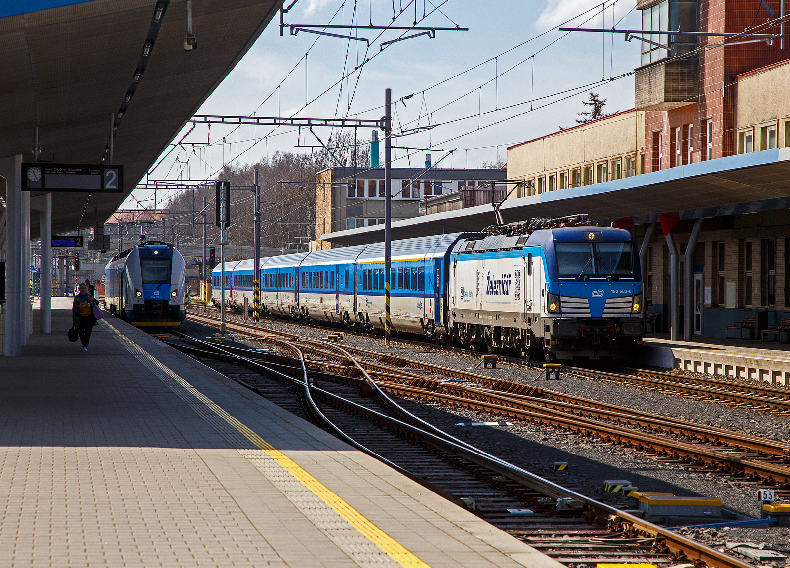 Die an die ČD - České dráhy (Tschechischen Eisenbahnen) vermietete Siemens Vectron MS 193 683-0 (91 80 6193 683-0 D-RAILL) der Lease RSL - Rolling Stock Lease s.r.o.(Bratislava/Slowakei) erreicht am 21.04.2023, mit dem IC 564 „Západní expres“ (Praha/Prag – Plzeň/Pilsen - Mariánské Lázně/Marienbad - Cheb/Eger), pünktlich den Zielbahnhof Cheb.