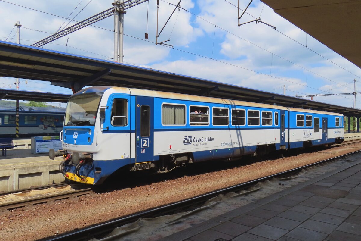 Der „Regionova“ 814 045-1/ 914 045-0 (CZ ČD 95 54 5 814 045-1/ CZ ČD 95 54 5 914 045-0), ein Dieseltriebwagen mit Niederflurbereich der tschechischen České dráhy (ČD), steht am 21 April 2023 in Karlovy Vary dolní nádraží (Karlsbad unterer Bahnhof), als Os 17106 nach Johanngeorgenstadt (Sachsen) via Karlovy Vary, Nejdek und Potucky, zur Abfahrt breit. Aber noch sind die Türen verschlossen. Die Fahrzeuge der ČD-Baureihe 814/914 entstanden im Rahmen eines Rekonstruktionsprogrammes (2005 bis 2012) aus den Fahrzeugen der ČD-Baureihe 810,ex ČSD M 152.0 ""Chcípák"" (Brotbüchse). Von den ČD werden sie als „Regionova“ vermarktet. Die Achsfolge 1'A' + 1'1 (jeweils zweiachsiger Trieb- und Steuerwage) merkt man als Fahrgast sehr. Technische Merkmale: Wesentliche Veränderungen gegenüber der Ursprungsbauart sind eine neue, leistungsfähigere Antriebsanlage mit dem Dieselmotor TEDOM M1.2C ML 640SE (ehemals LIAZ), welcher unter dem Wagenboden untergebracht ist. Es handelt sich um einen Viertakt-Reihen-6-Zylinder-Dieselmotor mit Turbolader und Ladeluftkühler. Jeder Zylinder hat zwei Einlass- und zwei Auslassventile und eine Einspritzdüse. Die Kraftstoffeinspritzung erfolgt direkt; es wird von einer elektronisch gesteuerten Einspritzpumpe bereitgestellt. Die Ventile werden von einer einzigen Nockenwelle angetrieben. Der Ventiltrieb ist vom Typ OHV (überhängende Ventile). Die Abgase werden durch das Auspuffrohr auf das Dach des Fahrzeuges geleitet. Der Verbrennungsmotor erfüllt die EURO II-Emissionsgrenzwerte. Die Motorkühlung wird wie Wasser gehandhabt – die Kühlung des Motorkreislaufs und des Getriebes erfolgt über einen Aluminiumkühler der Firma AKG. Der Kühlerlüfter wird hydrostatisch angetrieben. Die Schmierung des Verbrennungsmotors erfolgt durch unter Druck stehendes Öl. Die Kraftübertragung vom Dieselmotor erfolgt über ein hydromechanisches Getriebe VOITH DIWA 864.3E auf die Achse. Zudem wurde eine bequemere Innenausstattung mit behindertengerechter Toilette, bessere Arbeitsbedingungen für den Lokführer, bessere Fahreigenschaften und geringere Umweltauswirkungen der Antriebsanlage erreicht. Die Regionova sind nach wie vor mit Schraubenkupplung ausgerüstet und somit mit anderen Fahrzeugen freizügig kuppelbar. Im Steuerwagen, der zwischen den Radsätzen einen Niederflurbereich auf etwa 50 % der Wagenlänge aufweist, befinden sich das Traglastenabteil, eine Auffahrrampe für Rollstühle, die Toilette und 34 Sitzplätze. Der Einstieg liegt in diesem Bereich in Wagenmitte. Der Triebwagen, in normaler Bodenhöhe aufgebaut, besitzt Fahrgastabteile mit 50 Sitzplätzen. Die Antriebsanlage liegt wie bei der Ursprungsbauart unter dem Wagenboden, auch die Lage der Einstiege wurde bei den Triebwagen nicht verändert. Neben der Baureihe 814.0 wurden ab 2007auch Fahrzeuge zur dreiteiligen (Trio) Baureihe 814.2 umgebaut. Eine solche Einheit besteht dann aus zwei Motorwagen und einem Mittelwagen. Die dreiteiligen Züge bieten 135Sitzplätze anstatt bei den zweiteiligen Wagen 84. TECHNISCHE DATEN der BR 814.0/914.0 (zweiteilig / Duo): Hersteller: BR 810 Vagónka Studénka (heute Škoda Vagonka a.s.) Umbau: Pars Nova a.s. in Šumperk (heute auch Škoda) Spurweite: 1.435 mm (Normalspur) Achsfolge: 1'A' + 1'1 Länge über Puffer: 28.440 mm Leergewicht: 39.6 t Radsatzfahrmasse: 9,75 t Motorentyp: 1x TEDOM M1.2C ML 640SE (ehemals LIAZ) Motorhubraum: 11.946 Liter (Bohrung 130 mm / Hub 150 mm) Installierte Leistung: 242 kW bei 1.950 U/min Getriebe: Voith Diwa 864.3E Leistungsübertragung: hydromechanisch Anfahrzugkraft: 54 kN Höchstgeschwindigkeit: 90 km/h Sitzplätze: 84 Stehplätze: 105 Fußbodenhöhe: 570 mm (Niederflurteil)