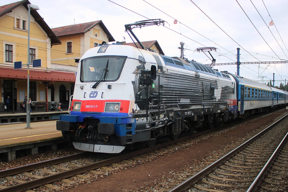 CD 380 013 treft mit ein Rychlyk aus Ceske Budejovice am Morgen von 27 September 2025 in Benesov u Prahy ein.