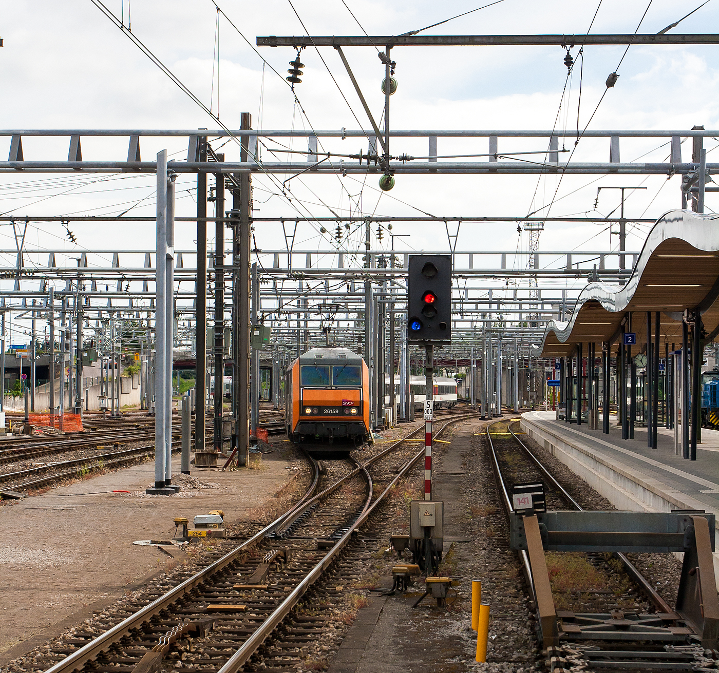 Die SNCF BB 26159 "Sybic" (91 87 0026 159-x F-SNCF) erreicht am 14 Juni 2013, mit dem Eurocity EC 90 „Vauban“ (Chur – Zürich – Basel – Straßburg – Luxemburg – Brüssel), den Bahnhof Luxemburg Stadt. Den Zug wird dann gleich hier die NMBS/SNCB HLE 2005 mit 2 weiteren belgischen Reisezugwagen übernehmen. Die Baureihe BB 26000 ist eine elektrische zwei System Mehrzwecklokomotive der Französischen Staatsbahnen (SNCF). Sie wurde zwischen 1988 und 1998 von Alstom, die zur damaligen Zeit noch als Alsthom firmierte, in Belfort gebaut. Die elektrische Ausrüstung wurde von Matériel de Traction Électrique (MTE) zugeliefert. Die BB 26000 ist auch unter dem Kunstnamen Sybic gut bekannt, dieses wurde aus synchrone für die Synchronmotoren und bicourant für die Zweisystemfähigkeit gebildet. (zum Bild)