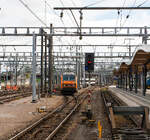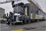 Während die von SBB Cargo für acht Jahre angemietet 193 072 mit einem Güterzug ohne Halt durch den Bahnhof von Aigle fährt, wartet am gleichen Bahnsteig auf dem Schmalspurgleis der TPC Beh 2/6 546 "Les Doigts" als R72 auf die Abfahrt nach Troistorrents. 9. Februar 2026 (zum Bild)
